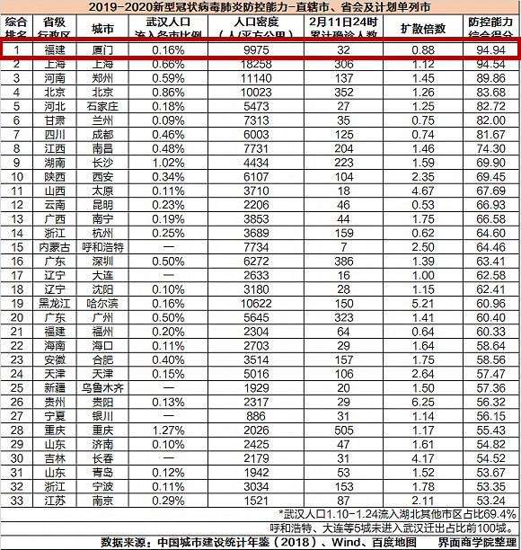 界面新闻旗下财经商业智库“界面商学院”的专家综合了截至2月11日24时各城市疫区人口流入比例、城市人口密度、新冠肺炎累计确诊人数以及扩散倍数等数据,并考量了城市人口行为模式及病毒特性等多重因素,分析得出了各城市疫情防控能力的最后得分。厦门排名第一,为94.94分。33个城市得分均值为66.45分。综合评估建议,随着返工潮的来临,综合排名表现较佳的城市,可以将尽快推动企业复工复产作为现阶段的工作重点。