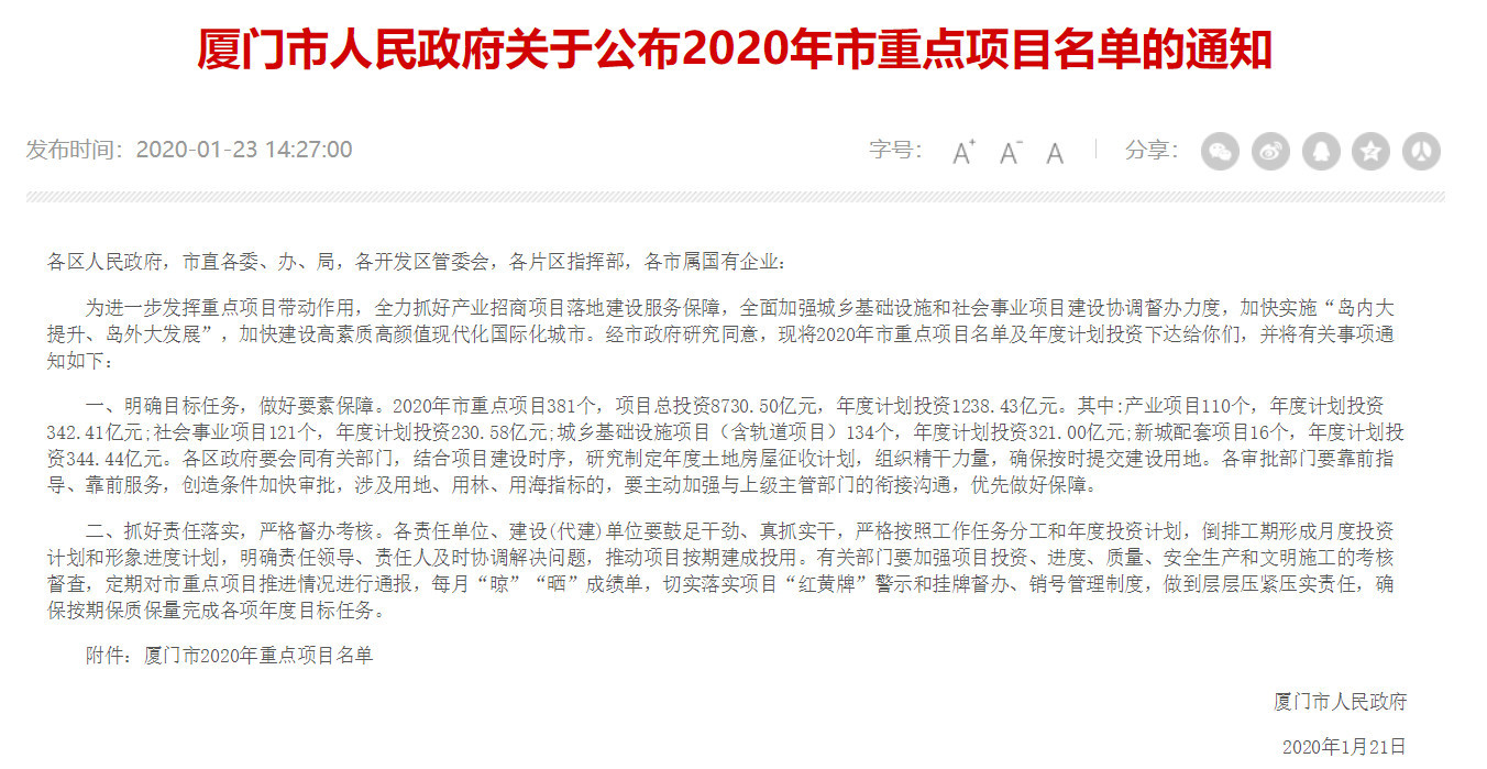 2020年厦门市重点项目381个,项目总投资8730.50亿元,年度计划投资1238.43亿元。《定了! 8730亿砸向厦门! 红头文件全面下达! 未来属于厦门!》