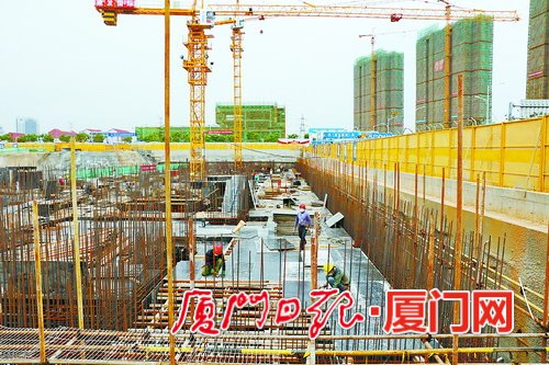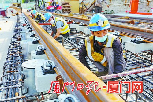 在地铁3号线湖里公园铺轨基地,工人在绑扎钢筋。