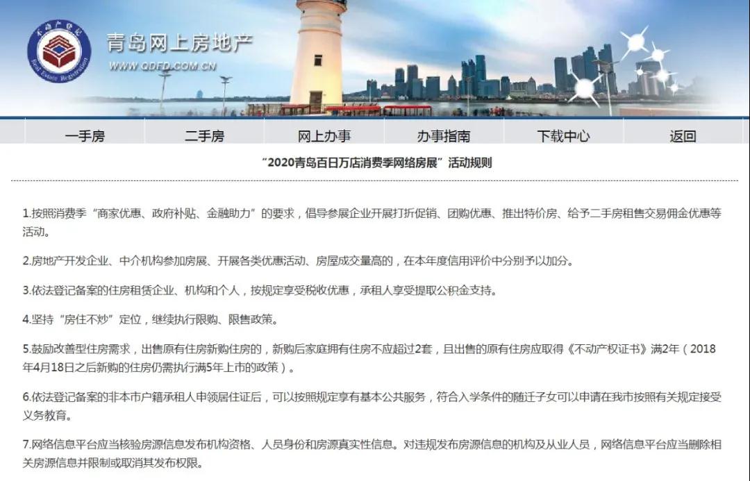 4月10日,青岛网上房地产网站发布《“2020青岛百日万店消费季网络房展”活动规则》,这一楼市限购、限售政策的松动,瞬间引发市场关注。