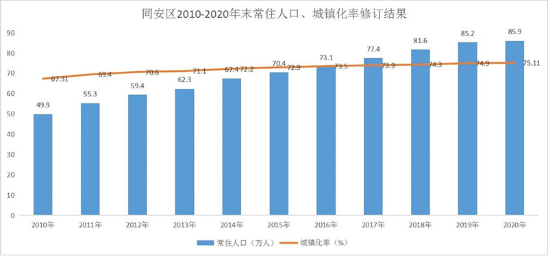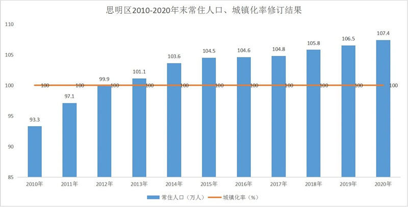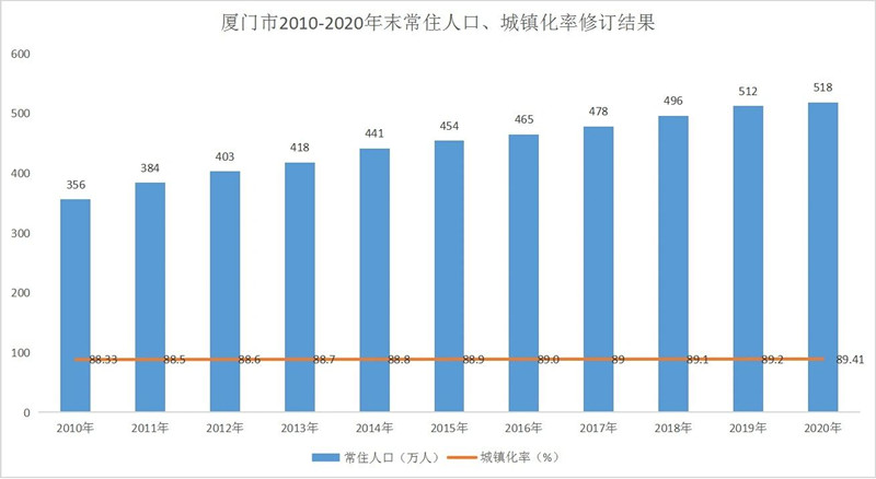 近日,结合厦门市第七次全国人口普查数据,厦门市统计局对全市及各区2010-2020年末常住人口、城镇化率进行了修订。修订结果显示,厦门市常住人口从2010年年末的356万人增加到2020年年末的518万人,城镇化率不断提高,从88.33%增长到89.41%,城镇化率位居副省级城市之首。