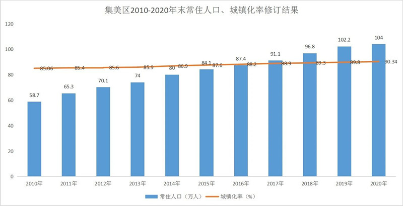 值得一提的是,全市及各区2010-2020年末常住人口、城镇化率的最新修订数据结果也直接印证了10年来厦门岛内外一体化发展的成果——数据显示,2020年厦门常住人口突破500万,达518万人,位列10年人口增幅最高的城市前十强。