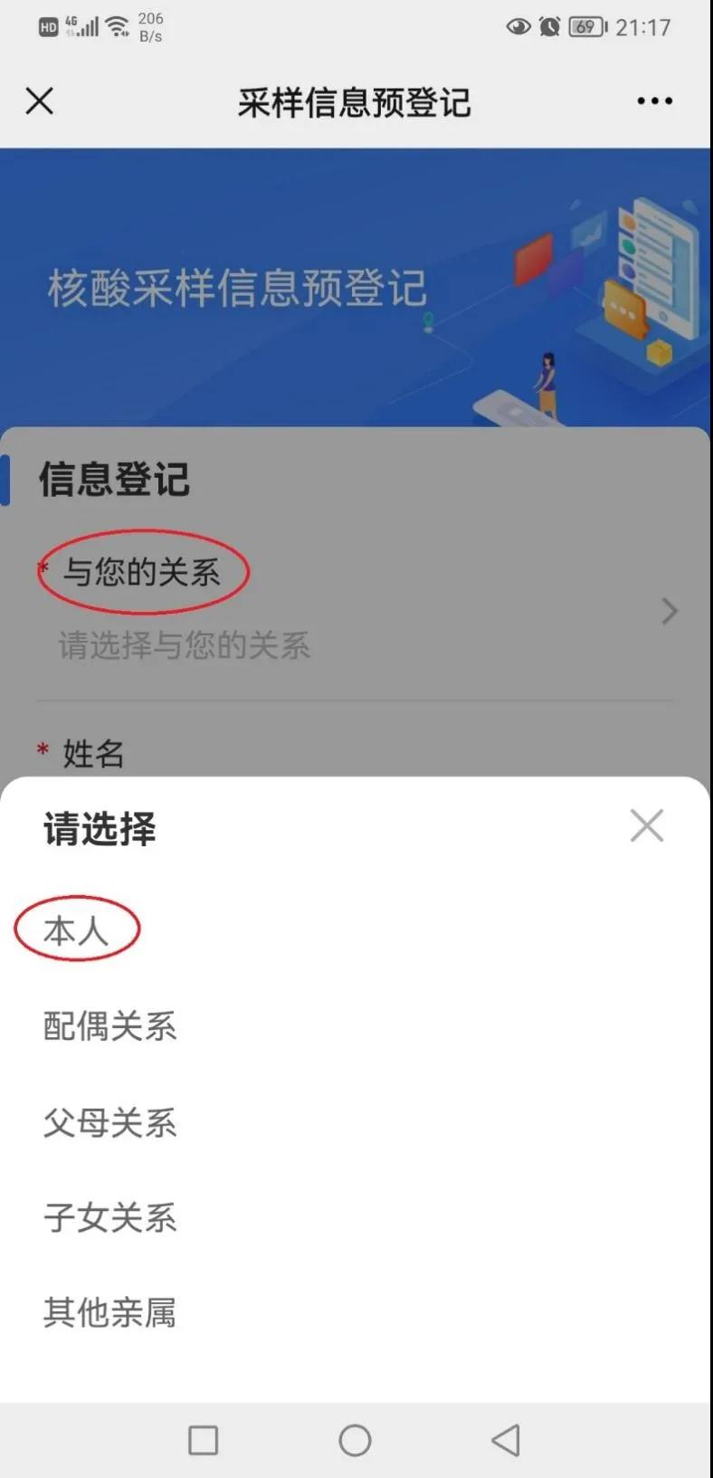为家人登记。选择采样信息预登记,与您的关系根据实际情况选择。特别注意,小孩子带户口本登记非常繁琐,大大影响采集进程,务必提前给小孩预登记好。