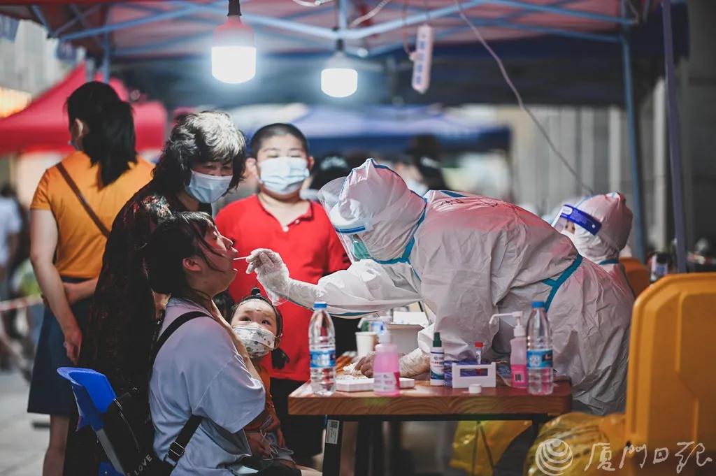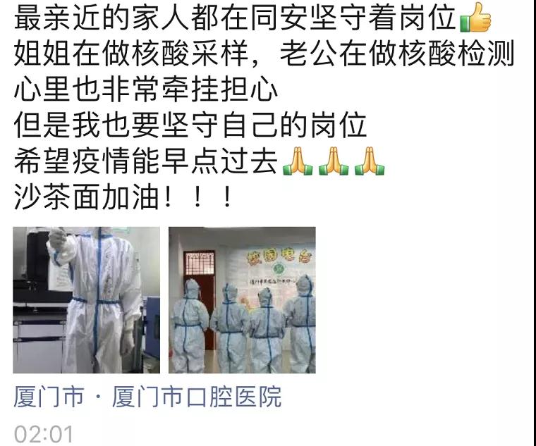 近几日,厦门医学院附属口腔医院医学检验科的林瑞碧都工作至凌晨。家住同安的她,为了疫情防控,选择了不回家,在医院过夜。与此同时,她的丈夫白佳鑫正在厦门市第三医院的核酸实验室中奋战,姐姐林雪青作为第三医院的护士,则在同安进行核酸采样工作。自从同安发现确诊病例后,丈夫和姐姐就一直在一线工作,基本没有回家,“虽然很久没有见面,但我们都在为同一战役而努力,目标一致,心在一起,就不会孤独,相信再见面的时候,就是胜利的时刻。