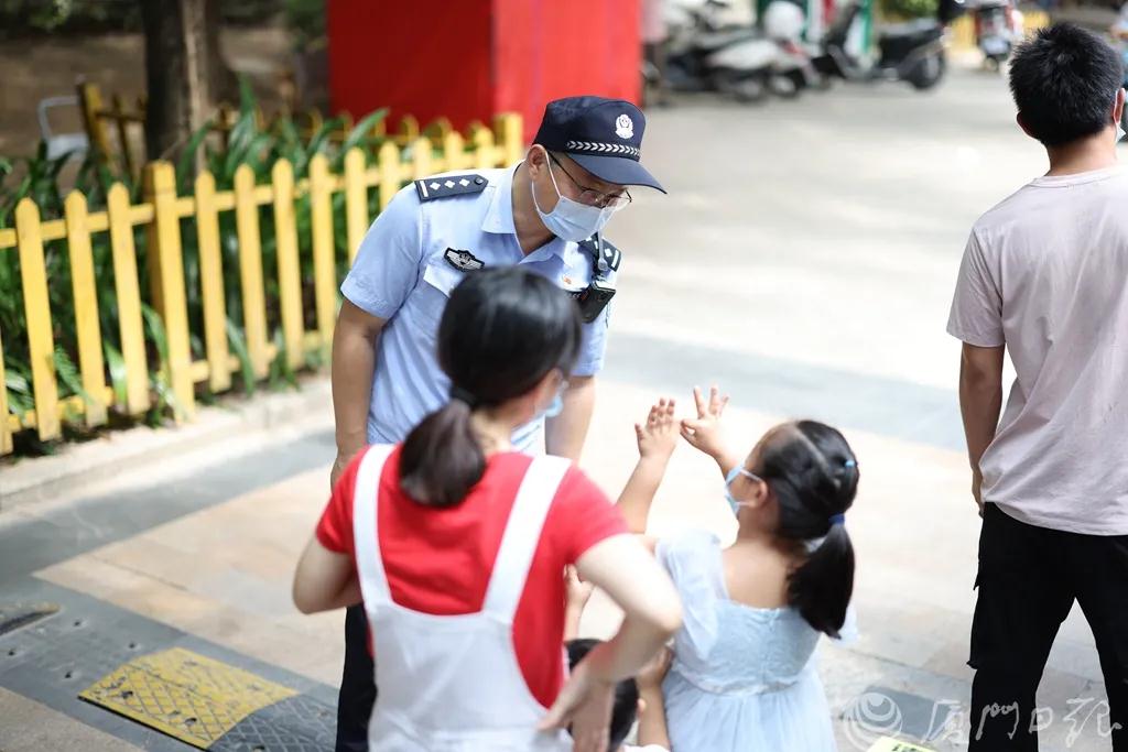 灌口派出所民警们维持秩序的同时,同社区工作人员一道耐心地为居民解答问题,还为排队居民送上矿泉水等降暑物资。