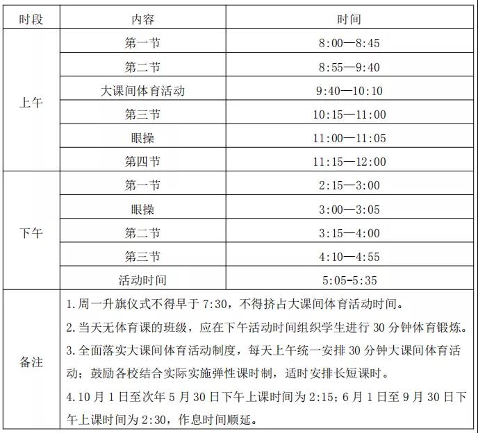 按照教育局发布的作息时间表,10月1日到次年5月30日,学校可执行冬令时,6月1日到9月30日执行夏令时。
