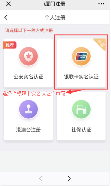 1.微信关注“i厦门”公众号(ixm0592),进入公众号,如还未注册i厦门账号,点击右下角的“i厦门”选择“我的i厦门”点击“注册”,选择“银联卡实名认证”,即可完成注册和中级实名认证操作。
