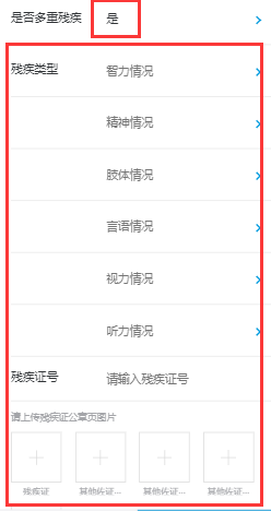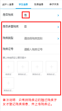 持有残疾证的随迁残疾适龄子女需要在“是否残疾”一栏选“是”,并选择是否多重残疾、填写对应残疾类别/残疾等级、填写残疾证号、上传残疾证公章页照片。