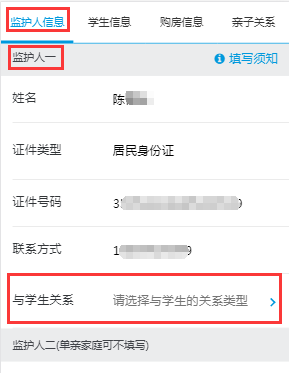 监护人一:系统自动获取家长i厦门实名注册的账号信息(无需家长填写),核对无误后,完善“与学生关系”选项。