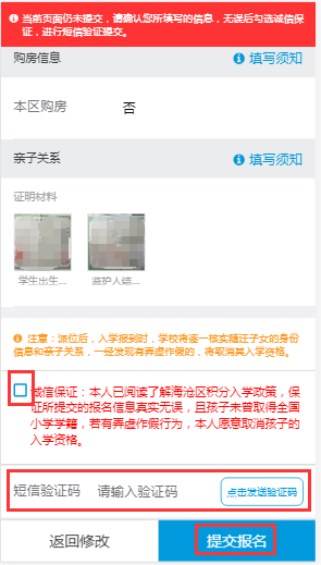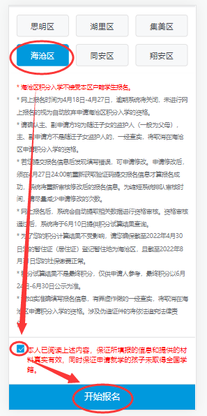 进入积分入学报名界面点击“网上报名”选择“海沧区”,认真阅读声明,勾选下方的保证声明内容,点击“开始报名”,即可进入报名登记界面。