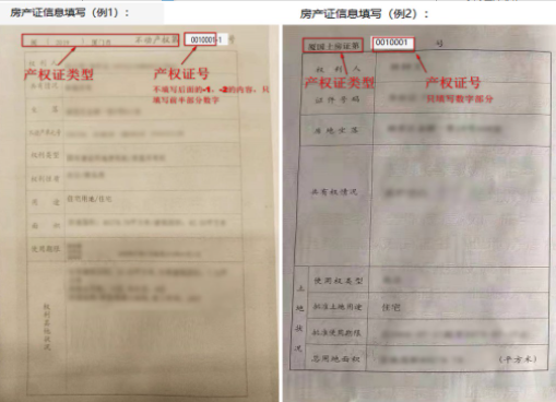2.产权证号的位置就在产权证第一页的第一行(图13),产权证号或合同编号若有英文字母请用大写。产权证号不要填写“ 第 ”、“号”、“-1”、“-2”,否则系统无法核查到房产数据。