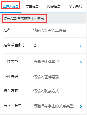 监护人二:根据实际情况正确填写监护人二的姓名、证件类型、证件号码、联系方式、与学生关系。