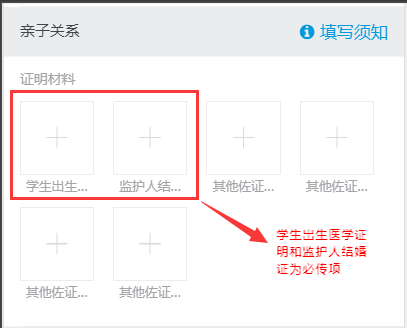 请上传孩子的出生医学证明和监护人结婚证。若孩子的出生医学证明丢失,请上传家庭户口本的户主页、父亲页、母亲页、孩子户口页、家长结婚证。