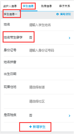 如果是多孩(多胞胎或相同监护人下多个当年年满6周岁的孩子),点击“新增学生”填写另一孩子身份信息。