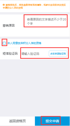 因个人原因,自愿放弃参加海沧区积分入学,可点击“撤销报名”。撤销报名需注明撤销原因,勾选“本人同意放弃积分入学的资格”,获取并输入验证码后提交,方可撤销报名。