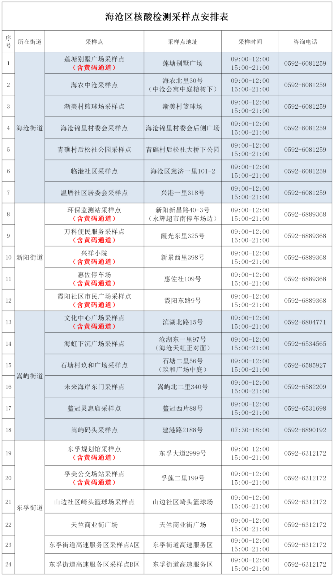 关注“今日海沧”我们每天都会带来最权威的报道核酸必检温馨提醒:5月3日,海沧区安排24个便民核酸检测采样点,4个街道均设有黄码人员专用检测通道。采样时间详见下方安排表。
