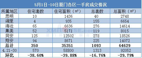 数据显示,2022年5月1日-5月10日,厦门一手房共成交1093套,成交面积64629㎡,其中一手住宅成交350套,环比下跌38.6%,成交面积35351㎡,环比下跌39.88%,日均成交约50套。