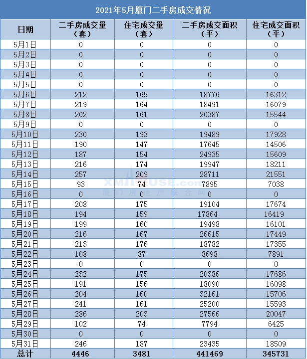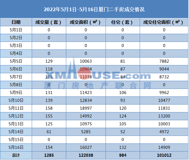 二手房方面,截至5月16日,厦门二手房共成交1285套,其中二手住宅984套,日均61套。