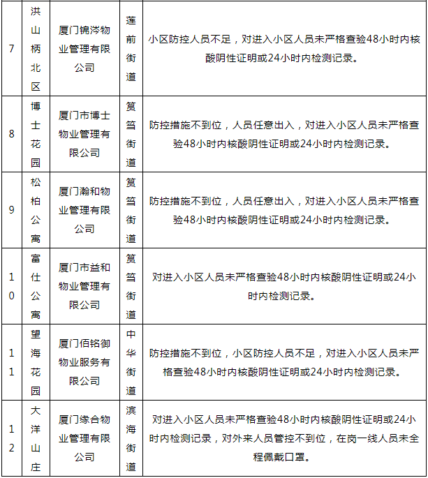 部分物业小区未能严格落实疫情防控措施,如:悦海园一期、集美中心花园、集美花园一期、大学湾二期(天鹅美苑)、集美大唐世家、杏林大唐世家、嘉源新城、兴阁里小区、香港公馆、联发欣悦湾、坑坪公寓、双桥明珠等小区,存在未查验核酸证明,未测温、亮码的现象。