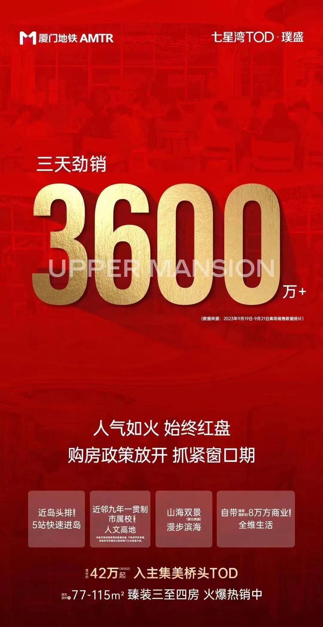 综合以上维度,我们发现坐席近岛头排的七星湾TOD·璞盛,是买房人的理想标的。项目一路不断超越热度高峰,2023年6-8月更是拿下厦门岛外同集翔片区销售面积、套数、金额三冠王(数据来源:中原地产厦门研究院)。而新政落地后,七星湾售楼部屡爆成交喜讯,3天劲销3600万+(数据来源: 2023年9月19日-9月21日案场销售数据统计),买房人用真金白银投票,直接反映了对产品的认可。