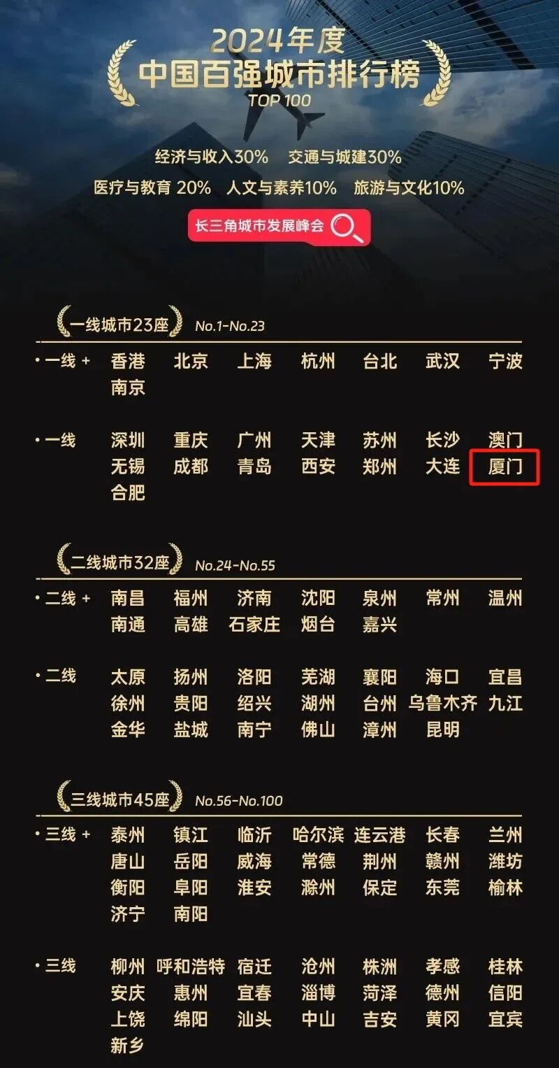 近日,由长三角发展峰会评选出的2024年中国百强城市名单出炉,厦门强势跻身一线城市!