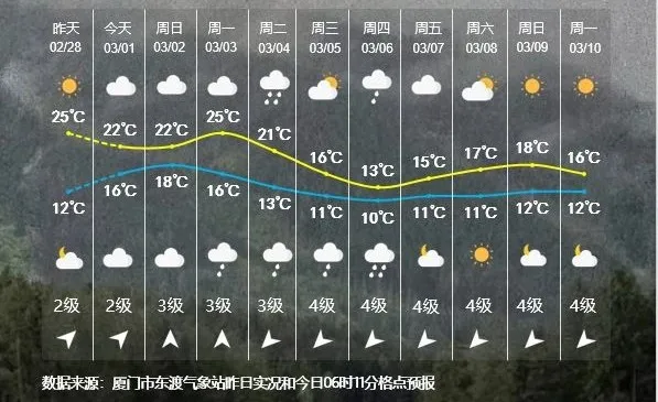 今天12时到明天12时,厦门多云到阴天,局部地区有阵雨,有雾或轻雾;偏南风2~3级;相对湿度:70~95%;气温:18~23℃。